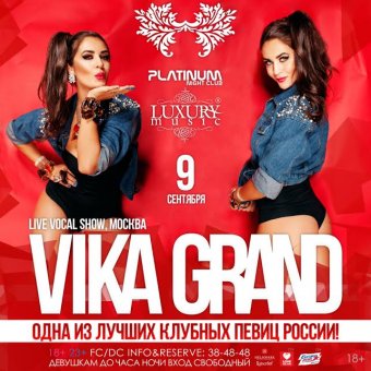 Vika Grand — одна из лучших клубных певиц России и бессменный вокал топовых дип-хаус продюсеров — Misha Klein, Lou Lou Players и Andrey Exx. Экс-резидент клуба «Soho Rooms» исполнит со сцены клуба «Platinum» свои самые яркие хиты и лучшие каверы: живой звук и абсолютно незабываемое шоу!