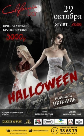 Приглашаем вас на борт корабля-призрака! Это исчезнувшее 350 лет тому назад судно и обнаруженное в море без команды… Ни одной живой души… На борту вас ждёт адская феерия и ужас, который будет поджидать на каждом углу! Целых две ночи «California music bar» погружается во мрак!