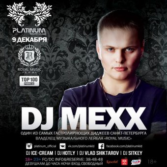 У нас в гостях один из самых гастролирующих диджеев Санкт-Петербурга, входящий в сотню лучших по версии портала PromoDJ. DJ Mexx — владелец музыкального лейбла «Royal Music» и автор множества ремиксов, звучащих на танцполах всей страны. Не пропустите его выступление в клубе «Platinum»!
