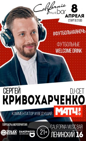 Сергей Кривохарченко — ведущий и комментатор «МатчТВ». Известен в творческих кругах Москвы как диджей, о музыкальной подаче которого ходят легенды. Постоянный резидент вечеринок «Культ тура», проводимыми Юрием Дудь и Евгением Савиным! Один из крупнейших экспертов в немецком футболе, прожил в Германии 3 года. Был главным редактором сайта «Esquire.ru». В эту ночь его ритмы будут качать California music bar!