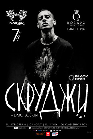 Ночной клуб «Platinum» приглашает вас на концерт одного из самых ярких артистов лейбла «Black Star Inc»! Наши стены содрогнутся от сочных битов и оглушительного голоса Скруджи! Мощную поддержку артисту, как всегда, оказывает бывший резидент клуба «Platinum» — Loskin!