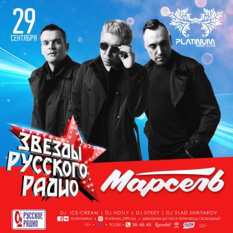 Звезды «Русского Радио» становится ближе! В пятницу, 29 сентября, на сцене клуба «Platinum» выступит группа «Марсель» с яркой шоу-программой! В рамках нового уникального проекта «Русское Радио» дарит вам невероятный концерт, полный позитива, драйва и потрясающей музыки! Со сцены прозвучат любимые песни коллектива, ежедневно радующие вас в эфире «Русского Радио»!