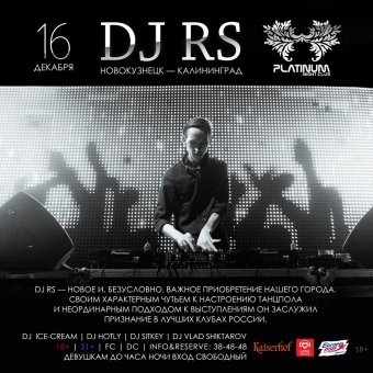 DJ RS — новое и, безусловно, важное приобретение нашего города. Своим характерным чутьем к настроению танцпола и неординарным подходом к выступлениям он заслужил признание в лучших клубах Хакасии, Красноярска, Новокузнецка и других городов России. На его счету успешная работа на одной сцене с топовыми диджеями страны и зарубежья, а также гастроли в более чем пятидесяти городах России!