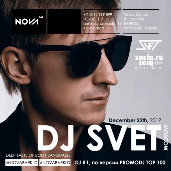 Совсем скоро, 22 декабря, Nova Bar озарит небесным SVETом. Этот артист заряжает вокруг себя все доброй энергией, мощным импульсом SVETлой силы! Его миксы и треки постоянно звучат на радиостанции Megapolis FM, он официальный DJ Зимних Олимпийских Игр в Сочи 2014 и победитель битвы диджеев «DJMAG» в Москве, 2008 г. Его рейтинг в 2017 году #1, по версии Promodj Top100. У нас в гостях DJ Svet (Москва).