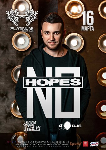 За вертушками клуба «Platinum» No Hopes — один из самых ярких отечественных хаус-музыкантов на мировой клубной сцене, а также лейблов 4DJS и DeepFamily DJs. Треки и ремиксы Александра выпускаются именитыми лейблами, среди которых Toolroom и Lou Lou Records, и звучат в сетах лучших диджеев Европы и Америки. No Hopes является постоянным участником различных рейтингов популярности и частным гостем топовых московских клубов. Не пропустите его долгожданное выступление в Калининграде!