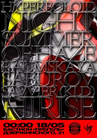 Ночь в Бастионе под флагами Hyperboloid — одного из главных электронных лейблов страны. Разрывная локальная поддержка. Новый альбом Summer of Haze! Впервые Глеб Raumskaya!