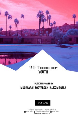 Итак, в эту пятницу взрываем октябрьскую ночь на вечеринке «Youth» вместе с Mugiwara, Bodyarock, а также нашими резидентами! Ребята обещали приготовить такой музыкальный коктейль, что никто не уйдёт трезвым, грустным и унылым! Нас ждут лучшие композиции в стиле r’n’b, фирменная неадекватность, странные, но притягательные танцы, утреннее беспамятство и искренняя любовь в стиле SKYBAR!
