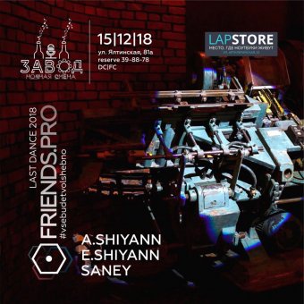 Всем привет! Друзья 15 декабря встречаемся в новой локации Завод! Фирменный саунд команды Friends.Pro от A. Shiyann & E. Shiyann & Saney Встречаемся 15 декабря, Клуб ЗАВОД, ул. Ялтинская, 81а, резерв 398 878, вход Free / dc / fc / 21+