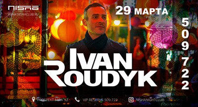 А в эту пятницу у нас специальный гость, да еще какой. Ivan Roudyk не просто красавчик и диск-жокей с отменным вкусом, а настоящий артист. Обладатель премии Russian Dance Music Awards, звания DJ № 1, резидент культовых московских клубов: XIII, Gallery, Zeppellin, Imperia Lounge, Soho Rooms, Motel, Киану.