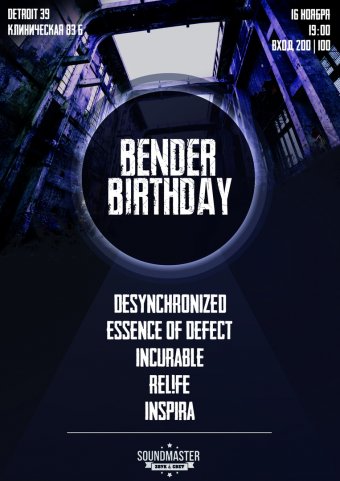 BENDER Birthday — это хаос, угар и разрушение! Именно поэтому мы приглашаем вас в Детройт. В этот вечер для вас будут выступать: — DESYNCHRONIZED - — Essence of Defect - — Incurable - — REL!FE - — Inspira - Вход: 200 / Репост 100! 16+