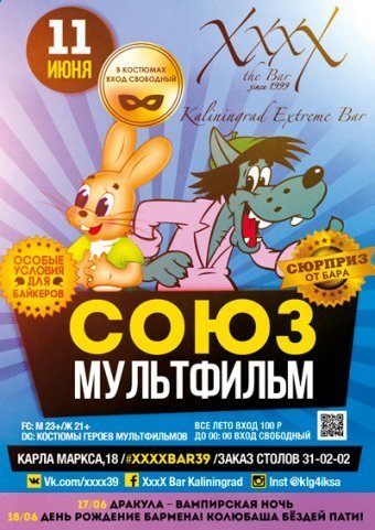Суббота в стенах «Иксов» озарится тематической вечеринкой! Мы объявляем ночь «Союзмультфильма»! Мы выросли, а такие родные «Волк и заяц», «Бременские музыканты», «Малыш и Карлсн» остались прежними! Кусочек доброго детства в баре «ХххХ» с трансляцией любимых мультфильмов!