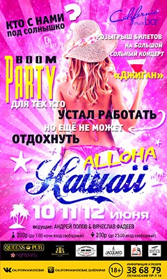 С первыми летними лучами солнца, так и хочется в жаркие страны! Зарыться ногами в песочек, потягивать вкусный коктейль и танцевать до утра! Если у кого то нет возможности уехать далеко сейчас, приглашаем уже на этих выходных отправиться на Hawaii вместе с «California music bar»! Только для наших гостей розыгрыш билетов на сольный концерт «Джиган».