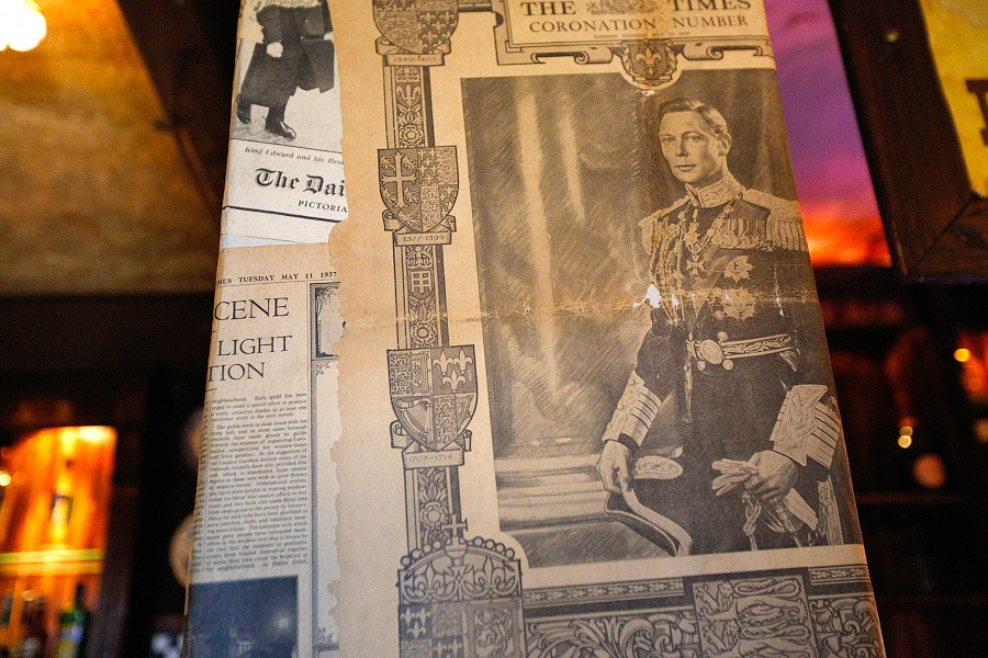 — Газеты на стенах в «Stoned Pony» — это не просто старьё. Каждая из них связана с определённым периодом в истории XX века. Вот газета «Times», датированная маем 1937 года, на первой полосе которой — фотография с коронации короля Георга, того самого, из фильма «Король говорит». Рядом — его матушка (показывает на фото — прим. ред.). А этого мы не показываем никому — газетный материал 1945 года о том, что Гитлер сдался. Нам пришлось его заклеить, так как сюда постоянно заходили «ряженые» ветераны и возмущались. Но они же не умеют читать по-английски и не понимают, что написано о победе над Гитлером.