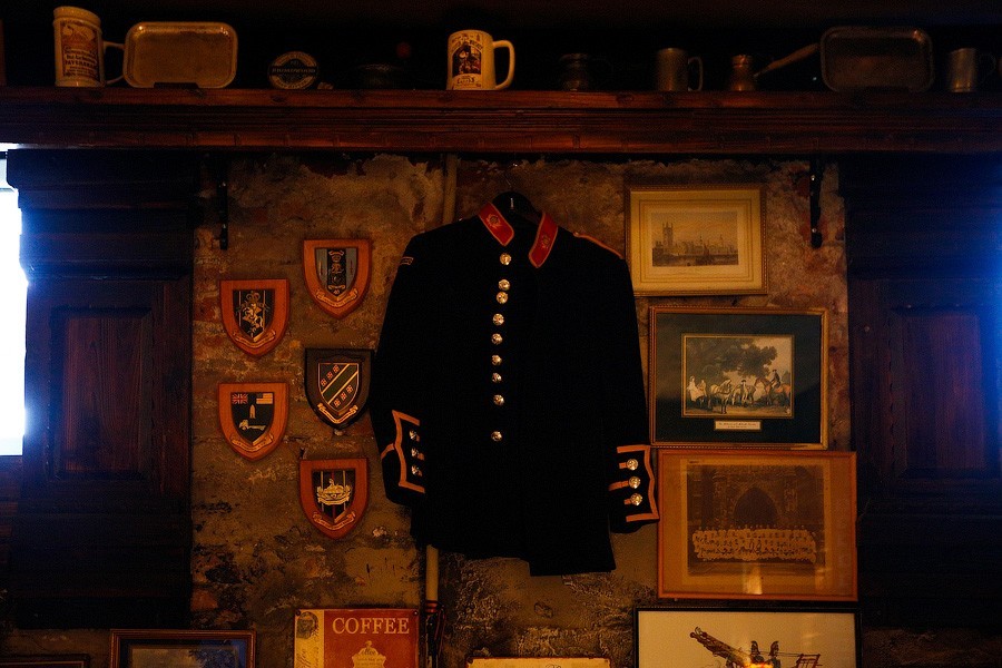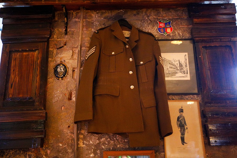 — Наши гости часто примеряют висящий на стене камзол музыканта военного оркестра её величества. Другой камзол принадлежал сержанту ирландской гвардии во времена Второй мировой войны. Потолки в баре — старые немецкие. Я сам по профессии дизайнер, так что сделал из них высокохудожественную, на свой взгляд, вещь. Целью было смастерить не «блестящую пластмассу» и прочие «остромодные» вещи, как везде, а нечто аутентичное, не «фейковое».
