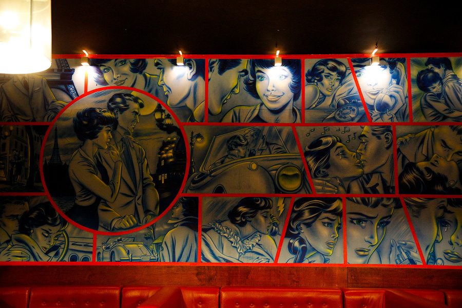 — Ещё заслуживает внимания панно с картинами в холле клуба, которое мы периодически меняем: раз в три года примерно. Сначала там был просто логотип радиостанции. Потом мы перекрасили его в «злой» комикс, а сейчас он у нас добрый — на любовную тему. Менять его пока что не хотим, нам нравится.