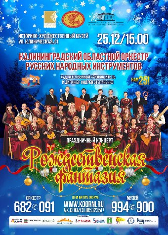 Праздничный концерт Калининградского областного оркестра русских народных инструментов. Рождество — время сказок и ожидания чуда. Сюжеты, связанные с этим волшебным праздником, служат источником вдохновения для композиторов, творивших в самое разное время. В рождественском концерте прозвучат произведения Петра Чайковского, Иоганна Штрауса, Джоаккино Россини, Имре Кальмана, Франца Легара, Виктора Беляева.
