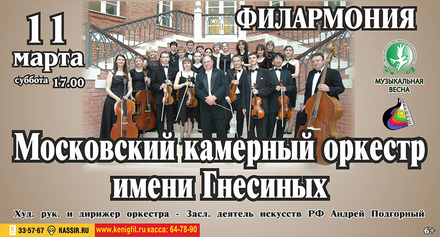 Лауреат международных конкурсов и фестивалей Московский камерный оркестр имени Гнесиных Художественный руководитель и дирижер — Заслуженный деятель искусств РФ, директор МГДМШ им. Гнесиных Андрей Подгорный Цена билетов — 150 руб.