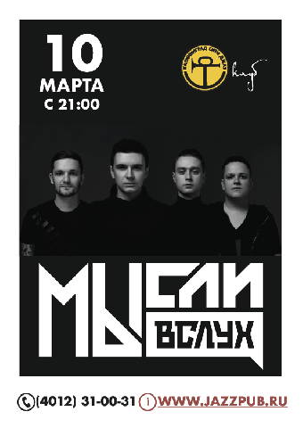 На сцене клуба «Kaliningrad City Jazz» выступит четвертьфиналист проекта «Голос 5» Илья Хвостов вместе со своей группой «МЫсли Вслух». В программе: мировые хиты, номера с шоу «Голос» и авторские композиции. Не потанцевать не получится!