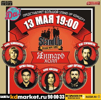 Большой праздничный концерт резидентов Stand Up шоу. В честь майских праздников эстафету юмора подхватят: Нурлан Сабуров, Слава Комиссаренко, Юлия Ахмедова, Стас Старовойтов, и Тимур Каргинов.