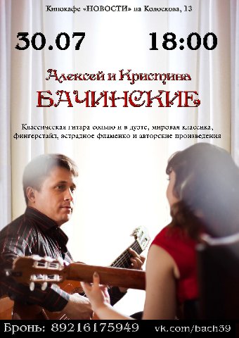В программе — классическая гитара сольно и в дуэте, мировая классика, фингерстайл, эстрадное фламенко и авторские произведения. Вход — 300 рублей (чай включён).