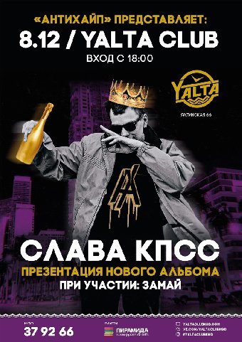 Самый дикий, едкий и амбициозный российский баттл-рэпер, а также сопровождающий его ЗАМАЙ, 8 декабря выйдут на сцену клуба Yalta , чтобы «охладить пыл» янтарных поклонников хип-хопа, а также перевернуть представления менее искушенных зрителей о современной русской энергетической поэзии.