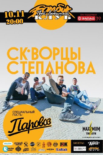 Ждем всех любителей бодрой музыки и позитивных танцев в клубе «Бамбук» на чумовом концерте питерских парней «Скворцы Степанова». Специальный гость — группа «Паровоз».
