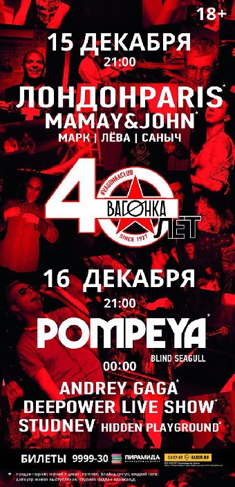 Любимому клубу, легенде нашего города, «Вагонке» исполняется 40 лет. Значение этого события сложно переоценить, поэтому праздновать будем два дня — 15 и 16 декабря. Лучшие люди города считают себя частью истории «Вагонки», лучшие музыканты города почитают «Вагонку» как свою alma mater, и потому пришла пора отдать дань уважения дорогим стенам, что звучали с настоящими калининградцами в унисон все эти годы. 40 — это красивая цифра, и каждый наполняет ее своим смыслом. Для «Вагонки» это точка. В следующем году начнется новая история. А теперь все внимание на афишу.