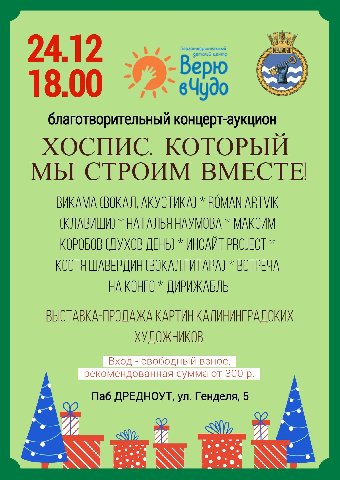 На аукционе у вас будет возможность приобрести картины калининградских художников, переданные ими безвозмездно для благотворительной акции. А также будут предложены памятные сувениры от «Верю в чудо».