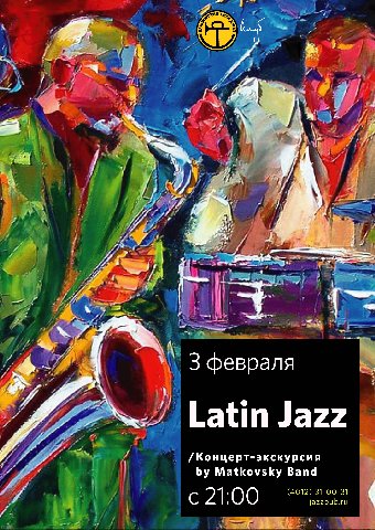 В программе Latin Jazz сочетаются африканские и латиноамериканские ритмы с джазовыми мотивами Латинской Америки, стран Карибских островов, Европы и США. Самба, босса-нова, румба, сальса, мамбо — в один вечер. И все это под руководством коллектива Маяковского Станислава Борисовича.