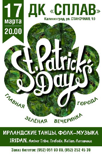 Первая в Калининграде школа ирландского танца Iridan Academy совместно с клубом кельтской культуры «Эйринн Глас» по сложившейся многолетней традиции приглашает всех, кто без ума от ирландских танцев и музыки, отметить самый главный праздник Зеленого острова и посетить ярчайшую вечеринку в честь Дня Святого Патрика!