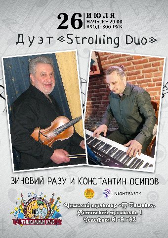 На нашей сцене Зиновий Разу (скрипка) и Константин Осипов (пианино). Дуэт «Strolling Duo» представит программу «Гавайский джаз».