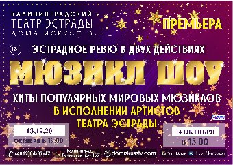 Сегодня трудно найти человека, который бы не слышал, что такое мюзикл. В настоящее время – это одно из самых популярных направлений в музыкальной культуре. Прелесть мюзикла в том, что здесь нет ограничений. Ему подвластна любая история, детская сказка, фильм или шоу с оригинальным сценарием. Он вбирает в себя разные музыкальные направления – оперетту и водевиль, балет и оперу, мелодии джаза и рока, цирковые и мультимедийные шоу, и многое другое. В эстрадном ревю «МЮЗИКЛ ШОУ» артисты Калининградского театра эстрады Дома искусств, не только знакомят зрителя с хитами популярных мировых мюзиклов в оригинальном нестандартном прочтении, но и приоткрывают занавес закулисья. Зрителю представится возможность узнать секреты подготовки шоу, воочию увидеть, что такое кастинг и кто такой продюсер, окунуться в мир забавных ситуаций и интриг среди актеров, в борьбе за главную роль, и главное, увидеть, как создается большой финал… Фантастические декорации и костюмы, потрясающее сочетание живого вокала и яркой динамичной хореографии, искрометный юмор и оригинальное прочтение хитов популярных мировых мюзиклов. Приходите и насладитесь вместе с нами!