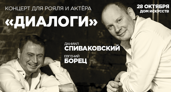 Концерт для рояля и актёра «Диалоги» с Даниилом Спиваковским и Евгением Борцем, премьера которого состоится в Калининграде 28 октября 2018 года в Доме Искусств — это уникальная форма концертного мероприятия. Удивительное сочетание экспрессии джаза и магии живого слова увлекают зрителя в водоворот ярких эмоций и переживаний. Спектакль выполнен по мотивам известных рассказов и повестей К. Воннегута, А. Куприна, С. Довлатова, М. Зощенко, что позволяет говорить не только о развлекательном, но и об интеллектуальном формате концерта. «Диалоги» — это не концертный продукт, а искусство. Концерт для рояля и актёра, несмотря на лаконичность формы, даёт богатейшую палитру для философских размышлений о вечных ценностях, понимание которых на сегодняшний день частично утеряно. Настоящее искусство определяется подлинностью и искренностью, высоким стандартом мыслей чувств и отношений, заданных талантливыми исполнителями «Диалогов». Рояль. Джаз. Экспрессия и вдохновение Актёра и Музыканта. Подарите себе возможность насладиться подлинным искусством.