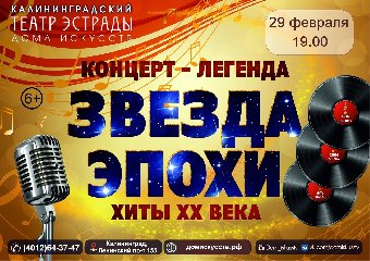 ХХ век подарил нашей стране и миру уникальную культуру эстрадного исполнительского мастерства и величайшие имена, вписанные в историю советской, российской и мировой музыки. Яркими красками незабываемых впечатлений и ощущений, которые запали в душу не одного поколения слушателей. Песни были рассчитаны на безупречное вокальное мастерство, поэтому на советской эстраде преобладали сольные певцы и певицы с потрясающими вокальными данными, а звучание их голосов заставляло замирать сердце и будоражило душу от первой ноты и до последнего аккорда. Концерт-легенда «Звезда эпохи» напомнит зрителям, возможно, слегка позабытые имена, подарит известным песням новое звучание и, конечно, наш дорогой зритель услышит любимые шлягеры.