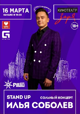 Сольный стендап Ильи Соболева в Калининграде! Живая импровизация со зрителями, актуальные шутки о наболевшем и бомбическое настроение — это то, чем Илья по праву заслужил звание одного из самых смешных комиков России. Когда говорят о современном юморе в России, то Илья Соболев — это одно из первых имён, приходящих на ум. В 2018 году Илья вышел за рамки телевизора и покорил YouTube. На канале Ильи уже более 700 000 подписчиков, а видео комика постоянно висят в топах портала. Видео сольного стендап концерта Соболева набрало более 1,7 миллионов просмотров, а сам комик заслуженно стал героем выпуска «Новый русский юмор» шоу Юрия Дудя «Вдудь». Юмор Ильи Соболева — это комедия для широкой аудитории. Это шутки близкие и понятные современной молодежи. Это импровизация, покоряющая своей неожиданностью и уникальностью. Это рассуждения, где каждый может узнать себя и посмеяться над жизнью вместе с комиком. Сольный концерт Ильи — это 2 часа живого юмора, яркой атмосферы и отличного настроения.