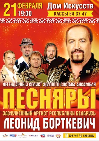 Легендарный солист золотого состава ВИА,«Песняры», заслуженный артист СССР Леонид Борткевич исполнит все хиты прославленного ВИА: «Белорусия», «Беловежская пуща», «Вологда», «Березовый сок», «Наши любимые» и другие. Подарите себе и своим родным хорошее настроение в преддверии праздника!