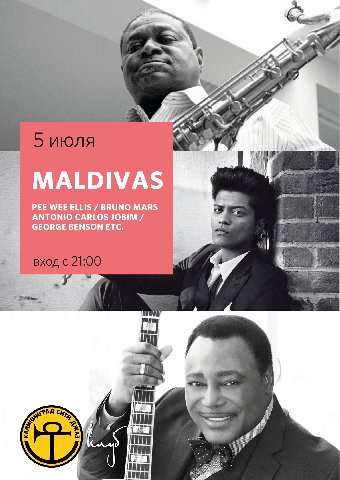 Музыкальный коллектив «Maldivas» исполнит для вас музыкальный коктейль известных хитов в авторской джазовой аранжировке. Прозвучат композиции авторов Pee Wee Ellis, A.C. Jobim, G. Gershwin, J. Benson, Bruno Mars, и другие. Билеты: 300 р.