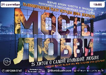 Роскошное и захватывающее шоу сезона в исполнении звезд Театра эстрады Дома искусств. Первое шоу европейского формата и уровня в Калининграде. Объемные проекции, 3D декорации, живой звук и современный балет – это подарок для Калининградского зрителя. Вы услышите вечные песни о самой большой любви!
