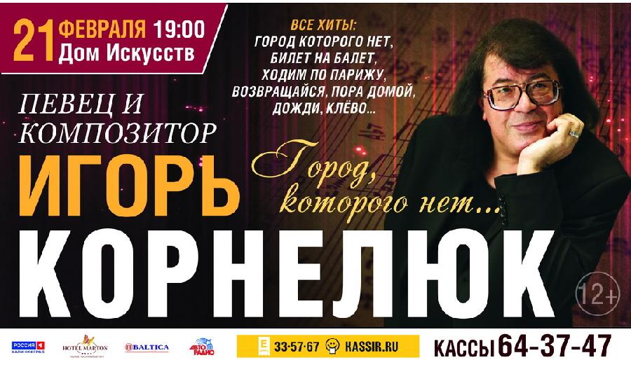 В преддверии праздника Дня Защитника Отечества мы приглашаем Вас на концерт любимца публики знаменитого певца и композитора Игоря Корнелюка с программой «Город, которого нет».