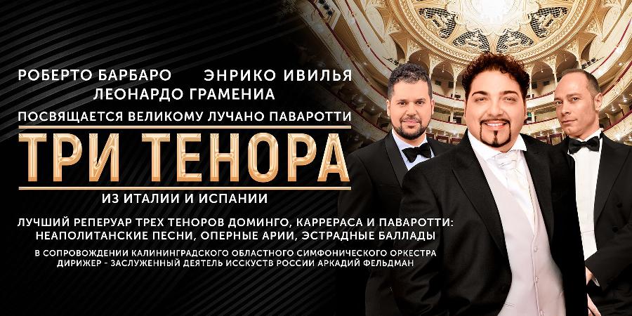 14 марта в театре эстрады «Янтарь-Холл» состоится концерт трех теноров из Италии и Испании, посвященный великому Лучано Паваротти. В концерте споют Энрико Ивилья (Италия), Леонардо Граменья (Италья) и Роберто Барбаро (Испания). Концерт пройдет под аккомпанемент Калининградского областного симфонического оркестра под управлением Заслуженного деятеля искусств России Аркадия Фельдмана.