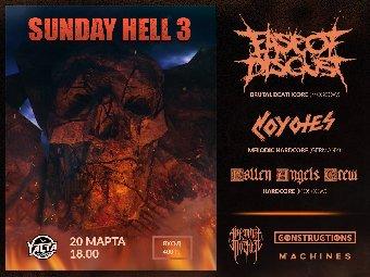 Близится «Sunday Hell 3», а это значит, что уже 20 марта вас ждут: сокрушительные риффаки от Ease Of Disgust, мощные низкочастотные прокачи от Victim Of Depravity, олдскульный рубка от Fallen Angels Crew, завёрнутый в хардкор дум-метал от Constructions, хип-хоп-джентуха от Machines и брейкдауны от Ape On The Rocket.