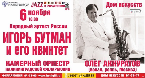 6 ноября в рамках фестиваля в Доме искусств при поддержке Министерства культуры РФ выступит легендарный отечественный музыкант — Народный артист РФ Игорь Бутман, который не нуждается в представлениях. Он будет играть со своим джазовым квинтетом и с Камерным оркестром Калининградской филармонии. Такое сочетание джаза и классики сулит слушателям большое удовольствие: нестандартные музыкальные «фишки» и блестящие импровизация гарантированы.