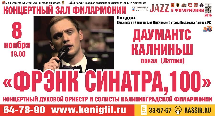 8 ноября на фестивале «Джаз в филармонии» прозвучат песни из репертуара легенды мирового джаза Фрэнка Синатры в исполнении молодого латвийского певца Даумантса Калниньша и российских музыкантов.
