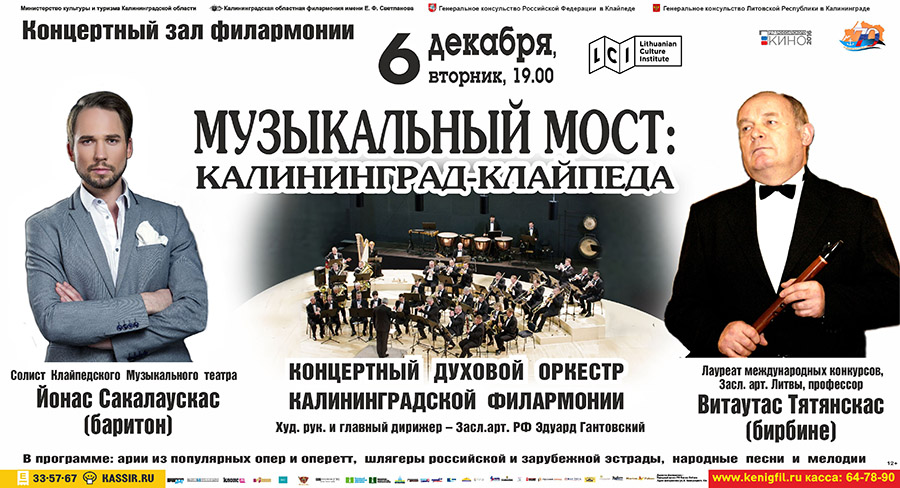 Предстоящий концерт — еще одно тому свидетельство. 6 декабря в международном проекте «Музыкальный мост: Калининград — Клайпеда» примут участие ведущие солисты и Концертный духовой оркестр Калининградской филармонии, возглавляет который художественный руководитель и главный дирижер Заслуженный артист РФ Эдуард Гантовский (дирижер — Народный артист России Виктор Бобков) и зарубежные гости. Вам предстоит приятное знакомство с замечательным вокалистом — солистом Клайпедского Музыкального театра Йонасом Сакалаускасом, обладателем бархатного выразительного баритона, и