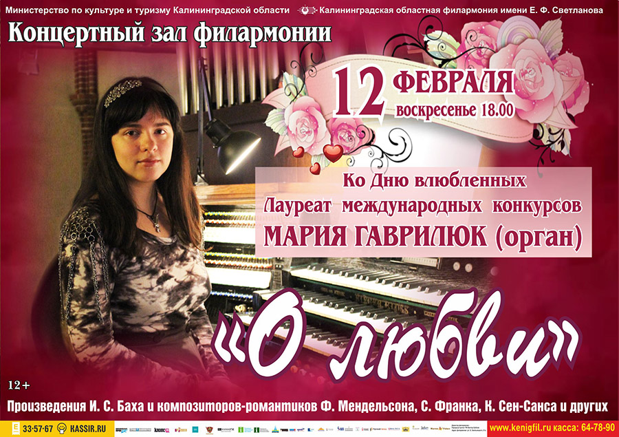 А 12 февраля, в воскресенье, в 18.00, приглашаем всех, чье сердце бьется чаще при имени любимого человека, на великолепную романтически-возвышенную программу, которая так и называется — «О любви». В честь грядущего Дня святого Валентина органистка Мария Гаврилюк одарит всех своих гостей музыкальными букетами, которые будут составлены из красивейших и изысканнейших творений великих композиторов. Несмотря на молодость, Мария успешно освоила репертуар мировой органной классики и в 2015 году стала лауреатом Международного конкурса церковной музыки, проводимого Академией музыки им. Ст. Монюшко в польском городе Гданьске. Девушка занимается в этой академии под руководством знаменитого польского органиста профессора Романа Перуцкого. Мария также является лауреатом российско-польского конкурса «Vox Polonica Petropolitana-2016», организованного при участии Польского института в Петербурге и Государственной консерватории им. Н. Римского-Корсакова.