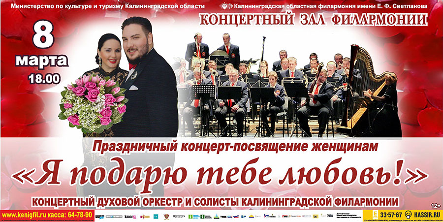 Филармония приготовила для прекрасных дам восхитительные музыкальные «букеты», способные стать желанным и красивым подарком к чудесному женскому празднику. Так, всем, кому по душе обворожительные легкие весенние напевы под звенящий медью и поднимающий настроение духовой оркестр, советуем прийти 8 марта в 18 часов в старинный зал на ул. Б. Хмельницкого на романтический концерт «Я подарю тебе любовь».