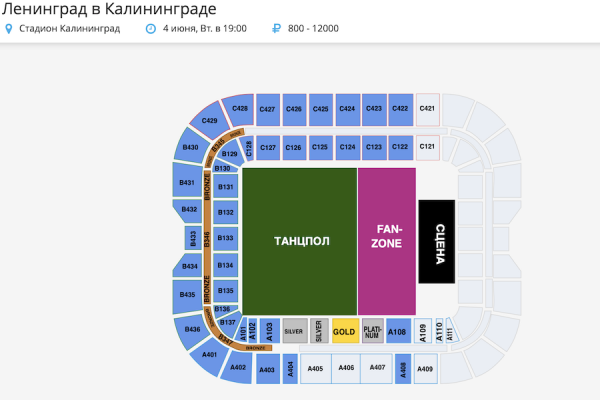 За минимальную стоимость предлагаются билеты на верхние сектора трибуны напротив сцены. Билет на танцпол стоит 1200 рублей, в