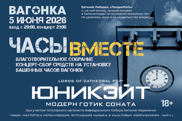 В калининградском клубе «Вагонка» 5 июня планируется провести благотворительный концерт «Часы вместе» (18+), цель которого — сбор средств на установку больших часов на башне здания клуба — бывшей лютеранской кирхи Христа. Как рассказал один из организаторов проекта Вадим Александров, на концерте будет представлен новый музыкальный проект «Юникэйт».