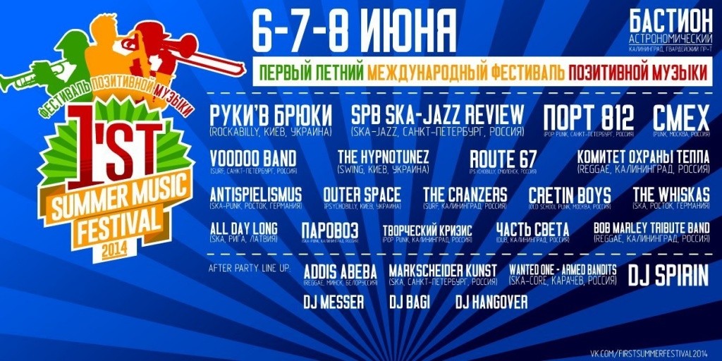 В Астрономическом бастионе пройдет фестиваль позитивной музыки «First Summer Festival». Гостей будут ждать два с половиной десятка групп из Германии, Латвии, Украины, Белоруссии, а также из Москвы,