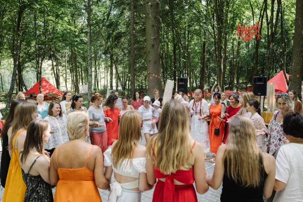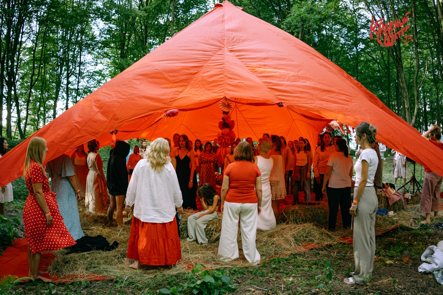 В этом году на «Красном Шатре» у участниц было много возможностей исследовать и пробовать разные традиционные практики для самоподдержки и восстановления: фольклорное пение, хороводы, банные ритуалы на берегу озера. Инсталляции в лесу по мотивам русских сказок с вечерней подсветкой помогали полностью переключиться с высоких скоростей современной жизни на восстановление и расслабление. Прожить свою сказку на опушке леса, у берега тёплого озера с песчаным дном.